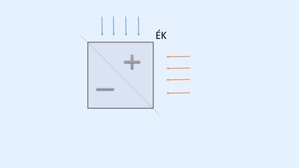 Ahogy az ábrán is látható, alapvetően két részre osztható az épület energiapotenciálja. Vannak pozitív energiapotenciálú, valamint negatív energiapotenciálú területek. Azt remélem sejtitek, hogy a pozitív energiapotenciál a kedvező égtájakkal van összefüggésben, hiszen onnan érkeznek, tehát a négyzet felső sarkában helyezkedik el ez a rész. A dinamikus tengelyen, ami a délkelet és északnyugati sarkokat köti össze, potenciálváltás történik, felhasználódik az energia, és az azalatti területek már negatív energiapotenciálú területnek számítanak. Természetesen ez nem azt jelenti, hogy a negatív polaritású terület rossz tulajdonságokkal rendelkezik, ez pusztán egy minőség.